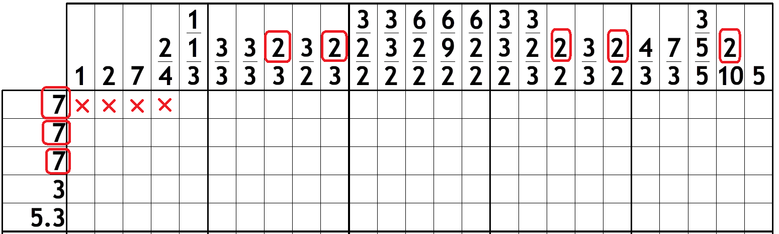 Consider this partial nonogram in which only the top few rows are shown. Focus on the first three rows and the “7” clues in them. Where can or cannot this “7” clue in the first row begin? Notice the circled “1” which belongs to column 5.