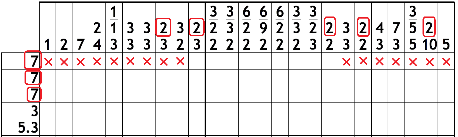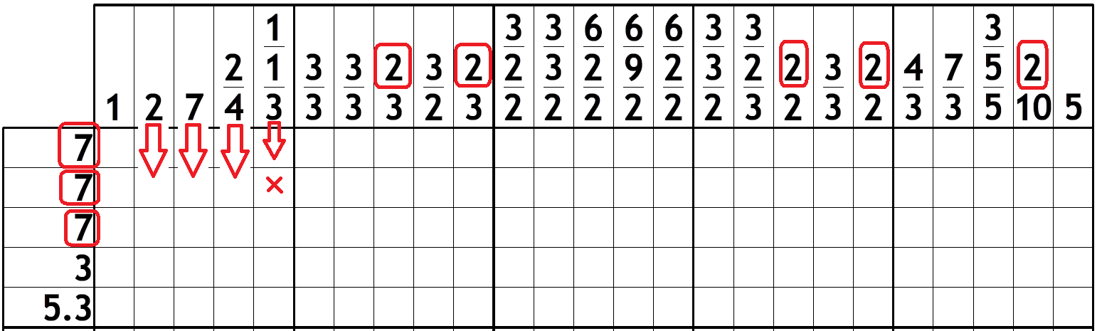 Now, let’s extend this logic to row 3. Look at all the circled “2”s, which are the first clues (this is extremely important) in their corresponding columns. Looking from the start of row 1, the first two circled “2”s prevent the “7” of row 1 starting anywhere before the “2”s, because the “3” nested between the two “2”s would extend to row 3, but it would be a lonely black square in row 3 because there would be a white to the left and to the right of it, because of the “2”s. Think about it for a while.