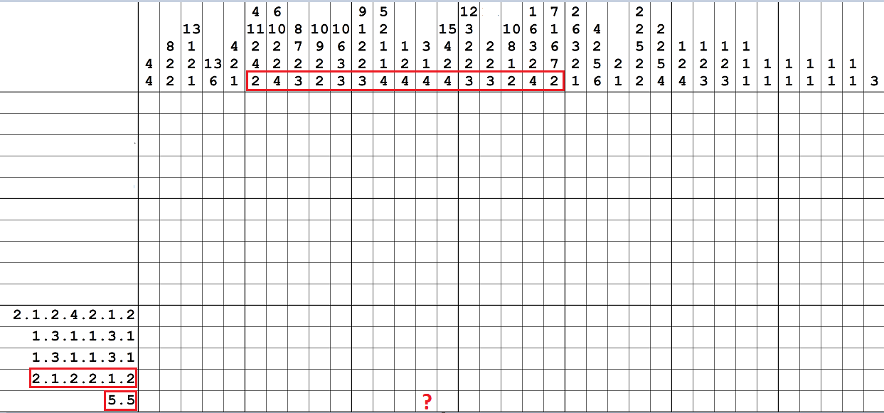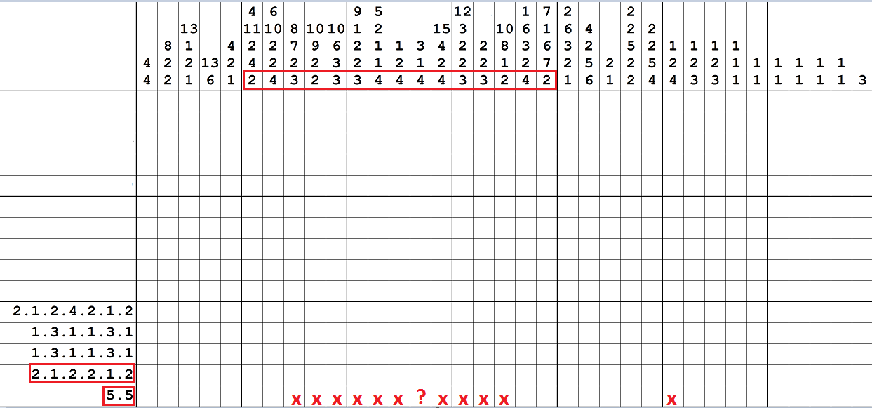 In my example, X=5, Y=2, and just by chance 2*Y+1=5 (but it doesn’t have to be the same as X). What’s important is that X>Y and that there are at least 2*Y+1 adjacent columns with bottom clues bigger than 1. In my example, there are actually 15 such adjacent columns, but be careful, you cannot put a certain “white” in all of them, only in the middle 15-2*Y. 🙂 Also, this partial puzzle shows that you can apply the same rule twice to the bottom row. There is another string, this time with precisely 5 adjacent columns and now you can mark only one cell as a certain white (5-2*Y). That’s the last red X in the image above.